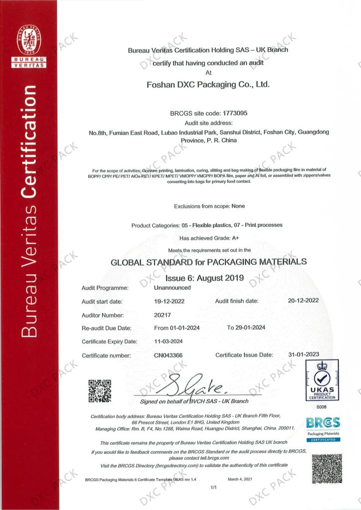 DXC Packaging is a manufacturer of custom flexible packaging pouches and films with over 19 years of experience and is BRC, ISO, FSC and GRS certified.