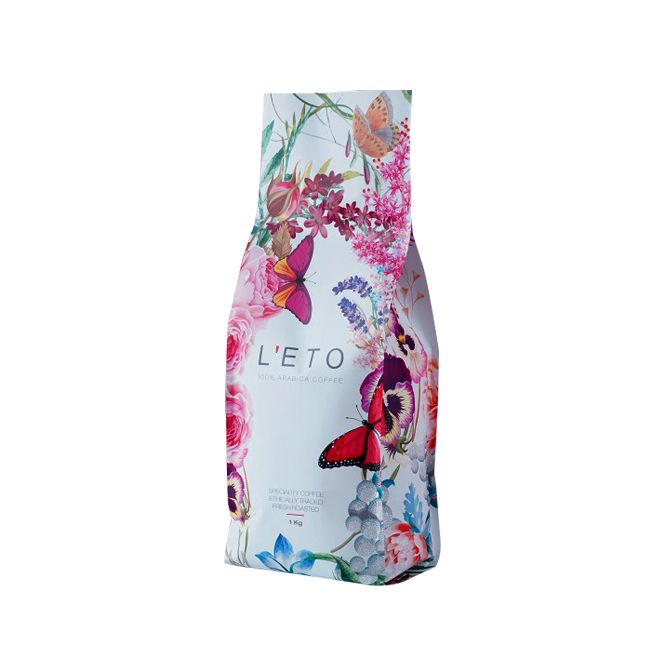 Gusseted bag with a one-way valve is one of the most popular choices of coffee packaging.