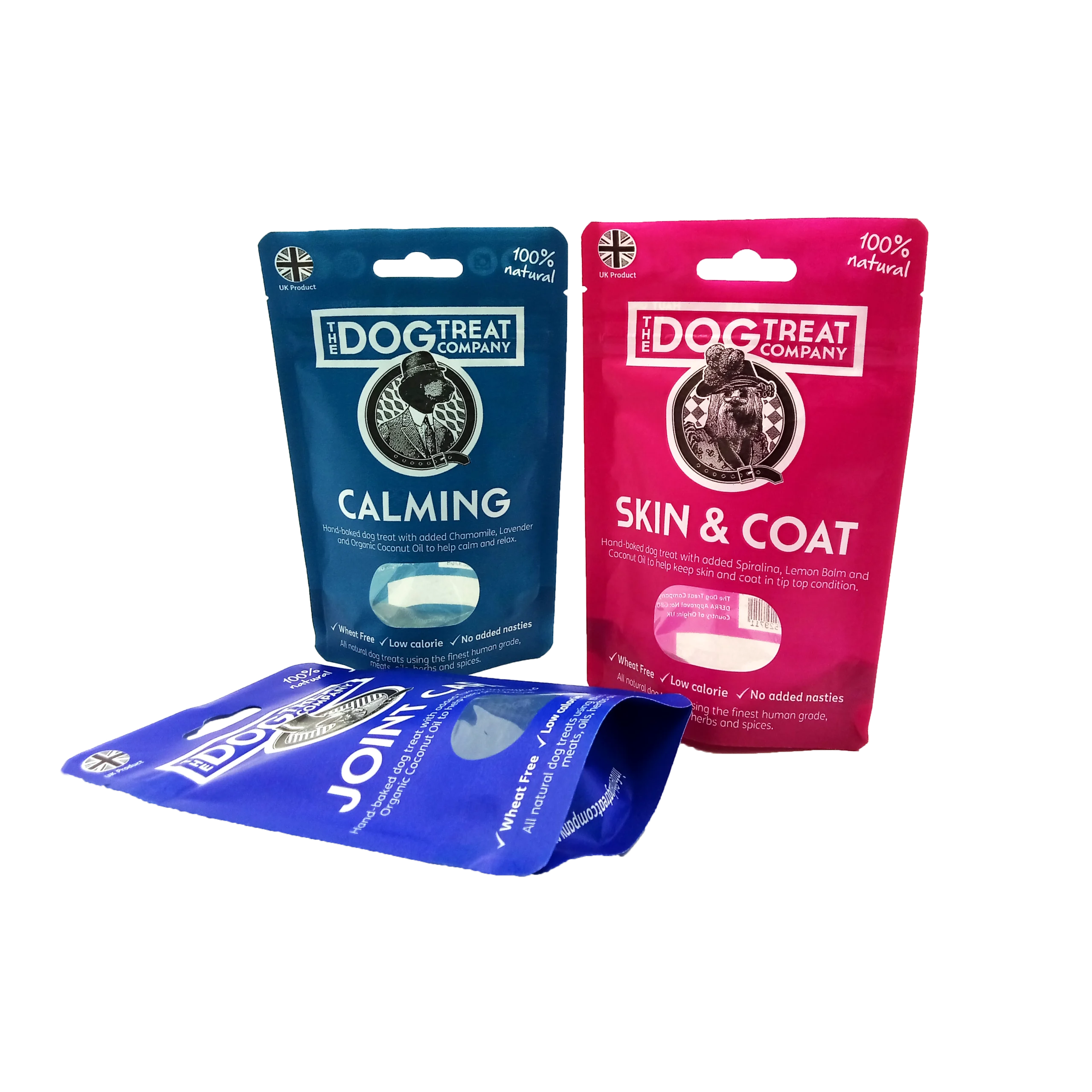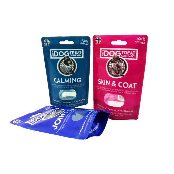 Hanging holes , clear windows and resealable zippers are three great options for custom dog treat bags. The high barrier material we use ensures that the dog treat is both on display and blocked from water and oxygen.
